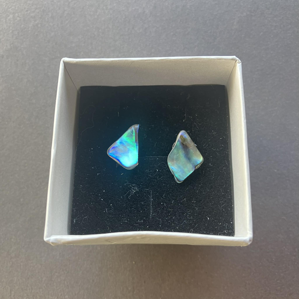 Nyers, természetes, kéken irizáló abalone kagyló fülbevaló, bedugós nikkelmentes szerelékkel.
