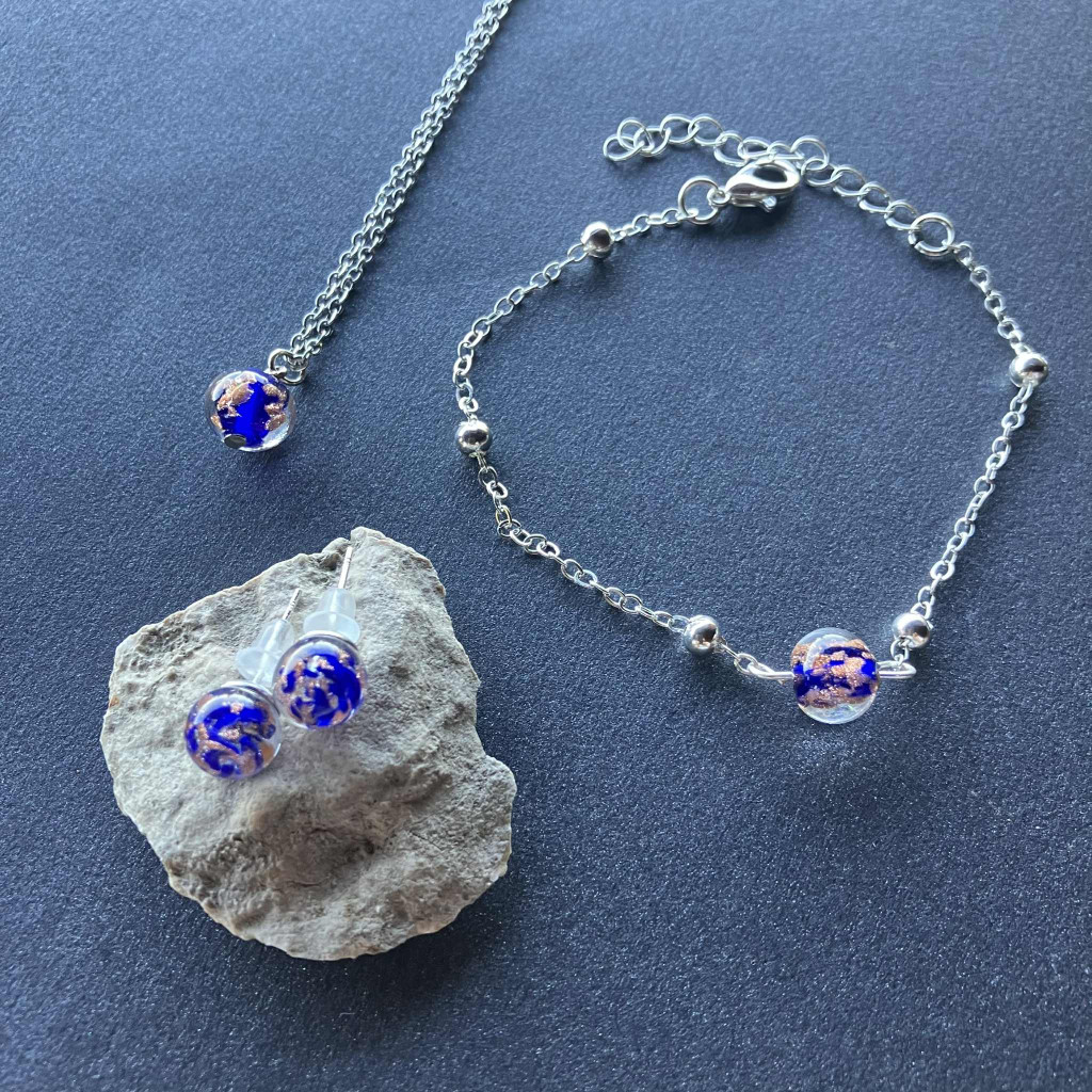Eredeti, kézzel készített, egyedi muranoi üveg szett. A szett tartalma egy egyedi, bedugós muranoi üveg fülbevaló, egy egyedi karkötő és egy egyedi, kézműves medál, hozzá illő lánccal, díszdobozzal.