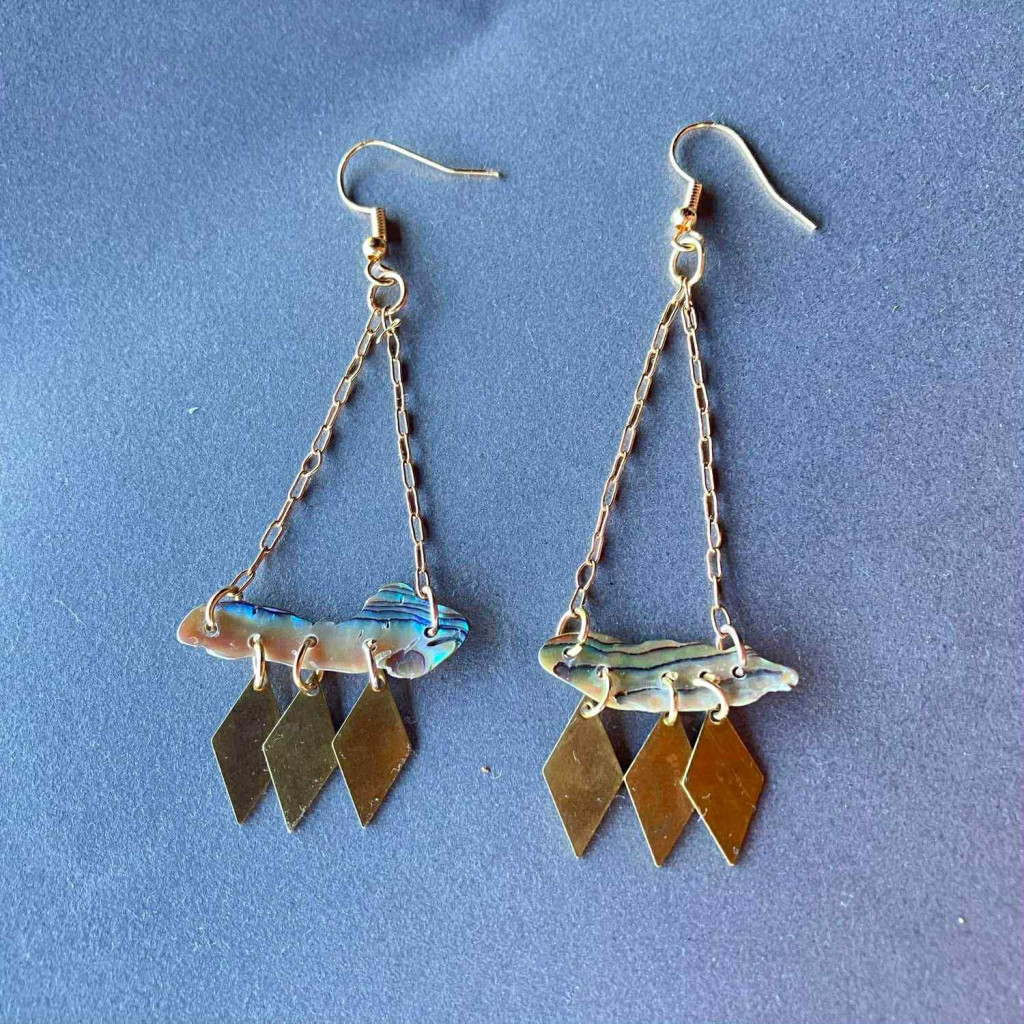 Sárgaréz és nyers abalone kagyló találkozik ebben a fülbevalóban. Igazán játékos a kis lógós rézlapoktól és természetesen irizál a kagyló,ahogy a fény játszik rajta.