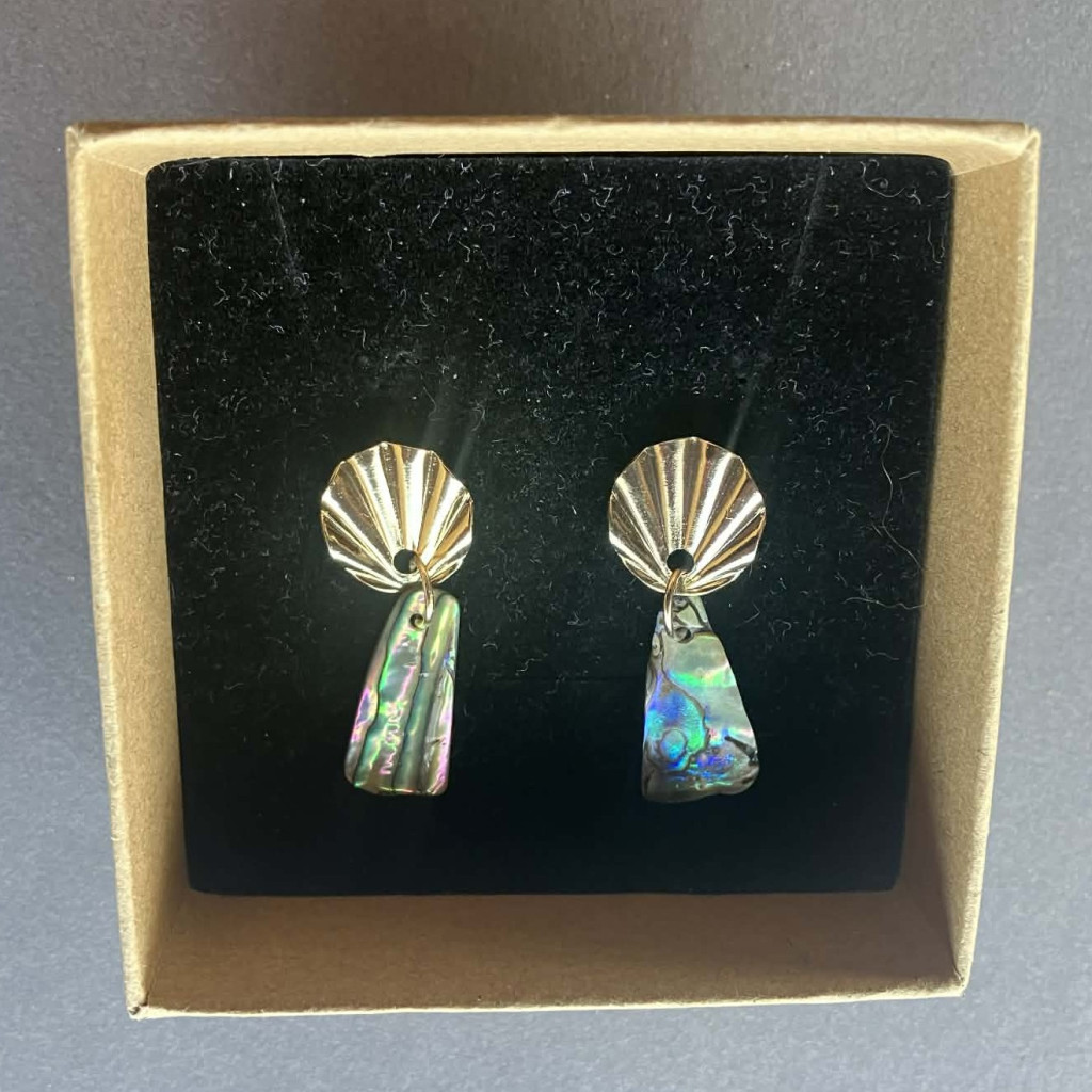 Szívárvány fénnyel irizáló, természetes Abalone kagyló fülbevaló sárgaréz bedugós akasztóval.