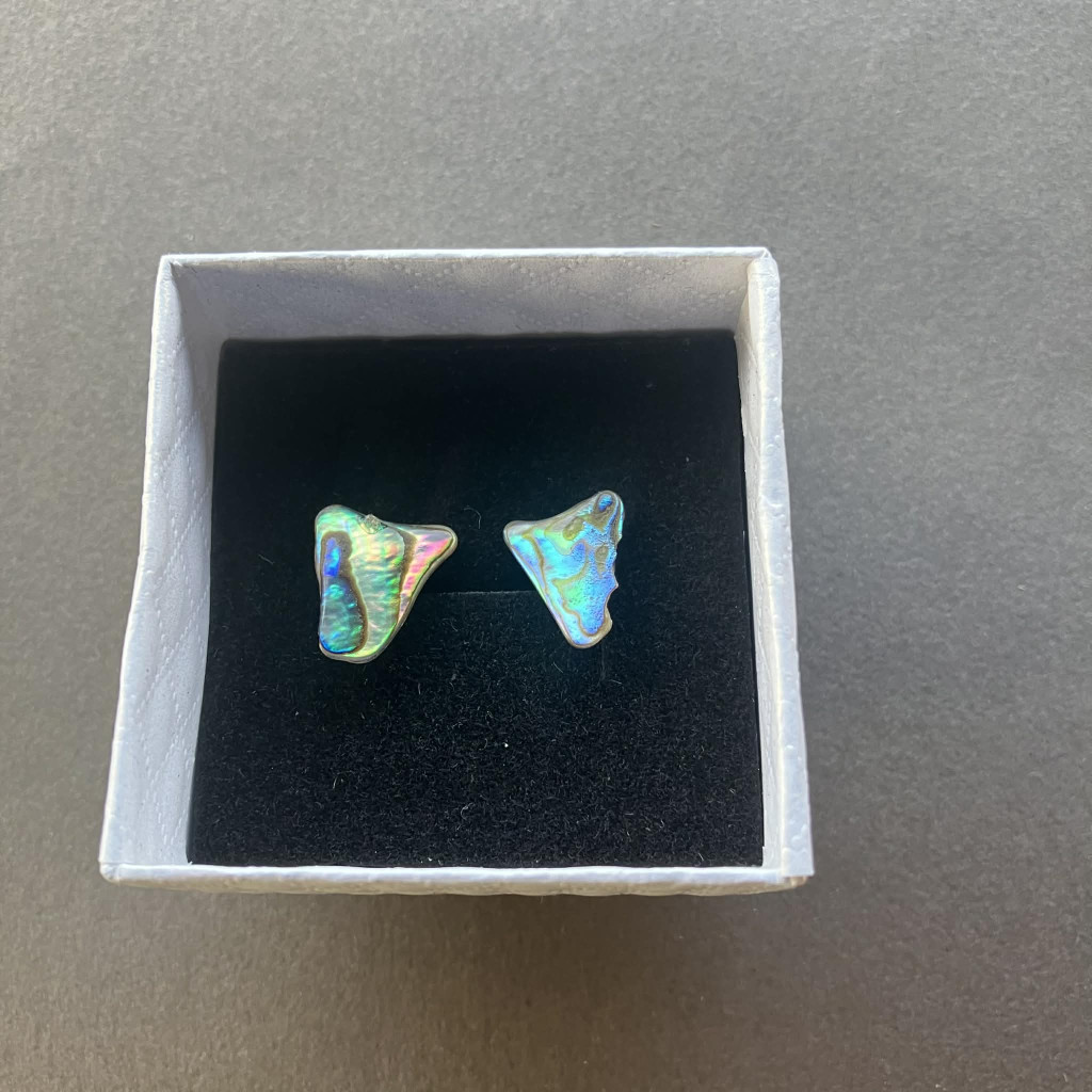 Szivárvány fénnyel irizáló háromszöges Abalone bedugós fülbevaló.
