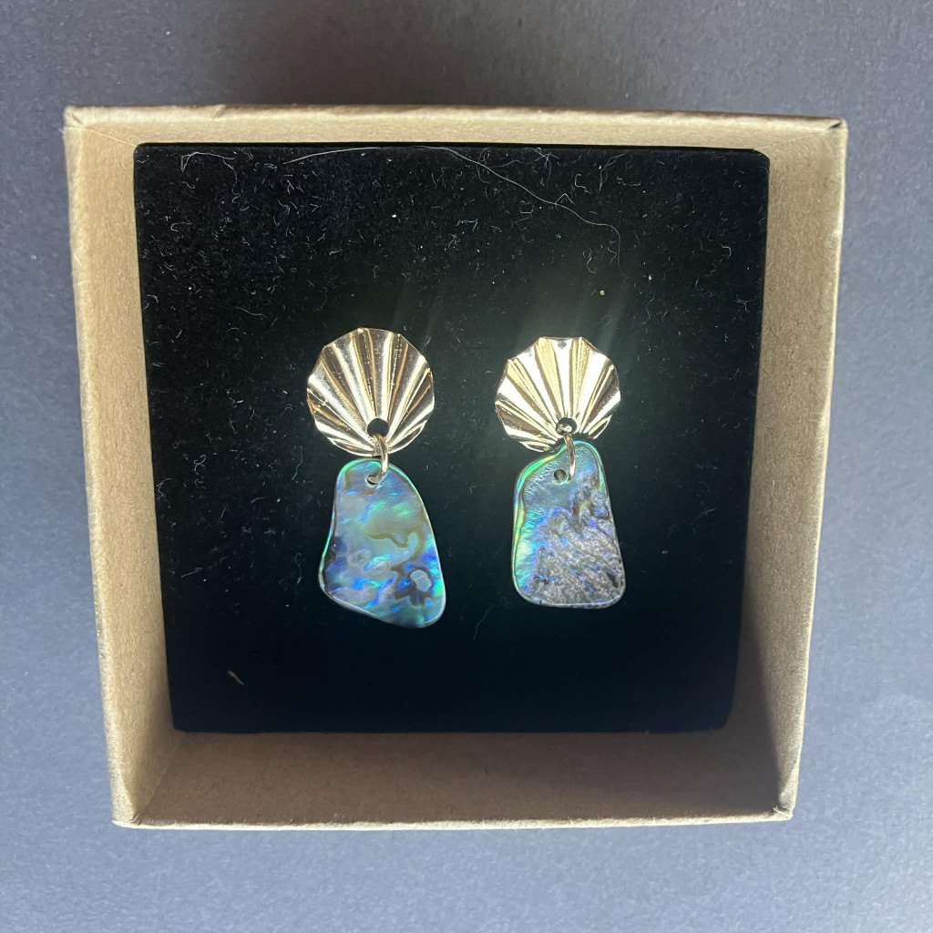 Abalone kagyló, vagy más néven tengeri fülcsiga irizáló kagylóhéjának darabjából készített különleges színű és mintájú fülbevaló.