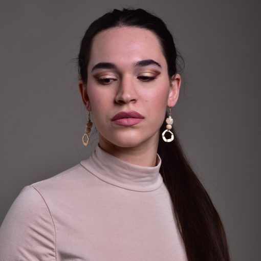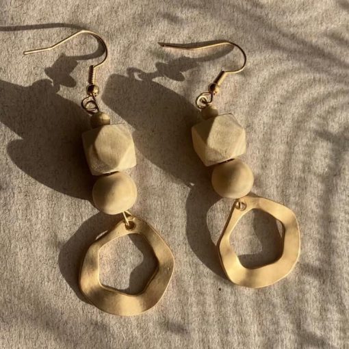 Csiszolt fa gyöngyök és sárgaréz fülbevaló.