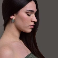 Arany és mélyzöld színű bedugós design fülbevaló. Galvanizált fémötvözet és akril.