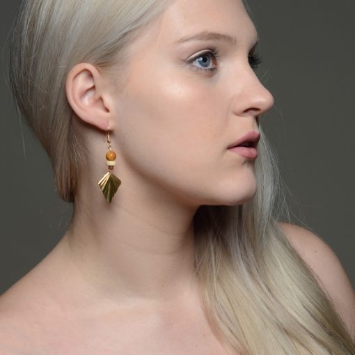 Sárgaréz és fa kézműves fülbevaló. Természet ihlette, kézzel készült különleges termék.