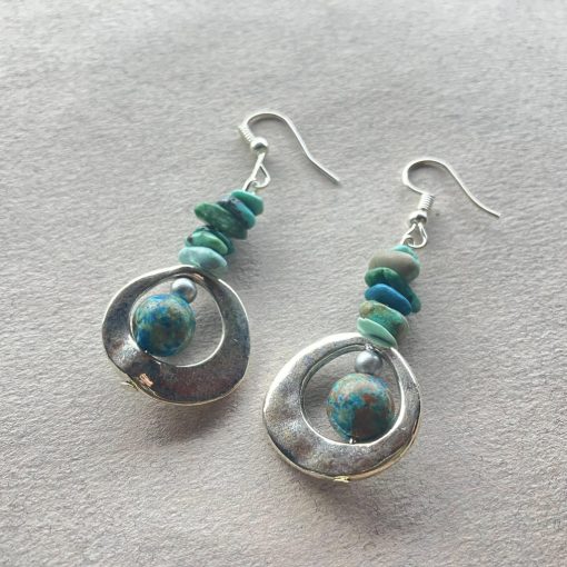 Egyedi zöld jáspis köves fülbevaló, rozsdamentes acél szerelékkel és nyers ásványtörmelékkel díszítve.
