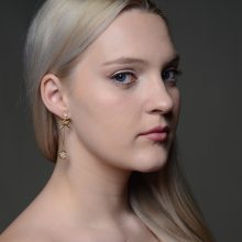Masnis, hosszított, sárgaréz szín, csillogó kővel. Bedugós, könnyű kis fülbevaló.