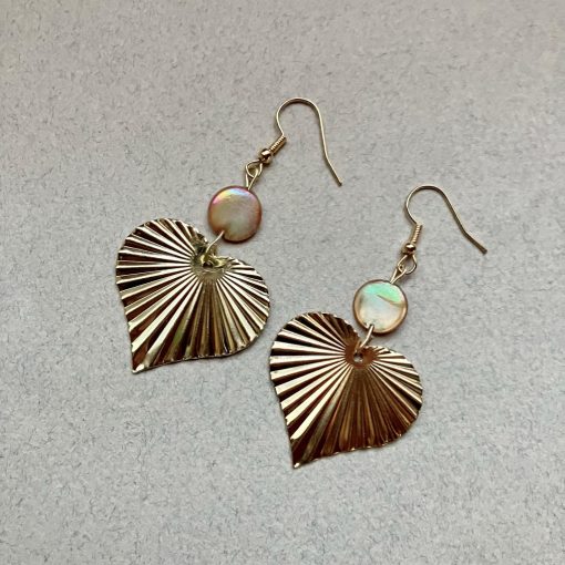 Bézs árnyalatú tenyészett gyöngy és sárgaréz szív fülbevaló.