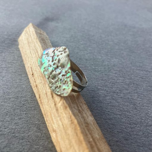 Abalone kagyéló, vagy más néven tengeri fülcsiga irizáló kagylóhéjának darabjából készített különleges színű és mintájú gyűrű.