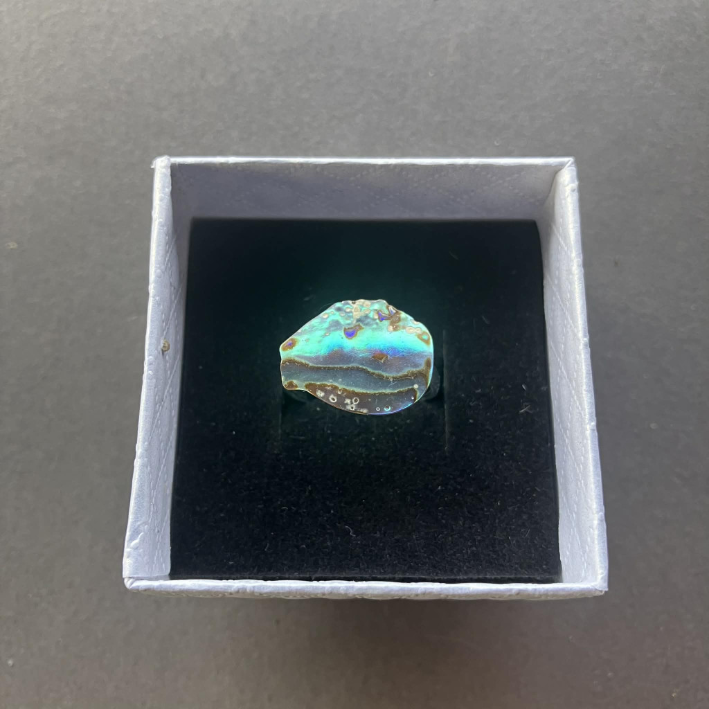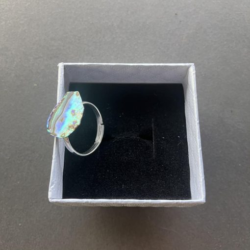 Abalone kagyéló, vagy más néven tengeri fülcsiga irizáló kagylóhéjának darabjából készített különleges színű és mintájú gyűrű.