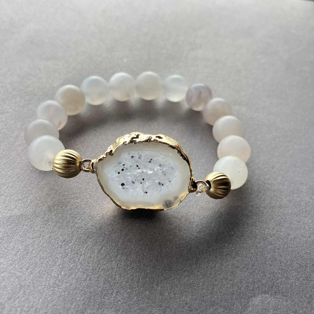 Világos achát ásvány, galvanizált arany színű fémötvözettel szegélyezve. 10 mm-es achát gyöngyökkel dupla soros rugalmas ékszerdamilra fűzve.