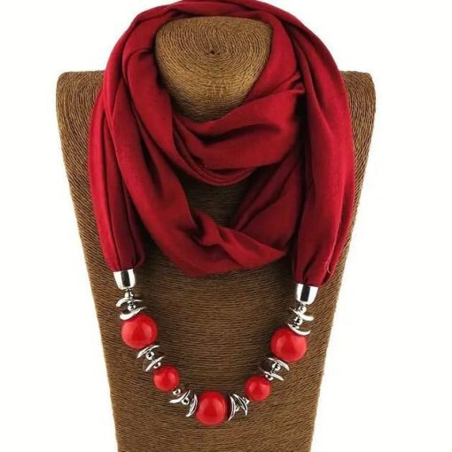 Igazán puha és intenzív meggypiros színű design kendő, ami egyben nyaklánc is. Ezzel a darabbal nem kell feltenni a kérdést, hogy kendőt, vagy nyakláncot viselj, mert ez lehet mindkettő. Akril gyöngyök és ezüst színű díszítő elemek a végtelenül puha pamut kendőn.