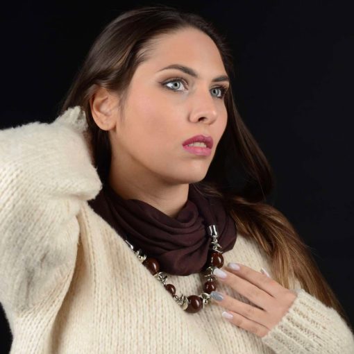 Igazán puha és intenzív barna színű design kendő, ami egyben nyaklánc is. Ezzel a darabbal nem kell feltenni a kérdést, hogy kendőt, vagy nyakláncot viselj, mert ez lehet mindkettő. Akril gyöngyök és ezüst színű díszítő elemek a végtelenül puha pamut kendőn.