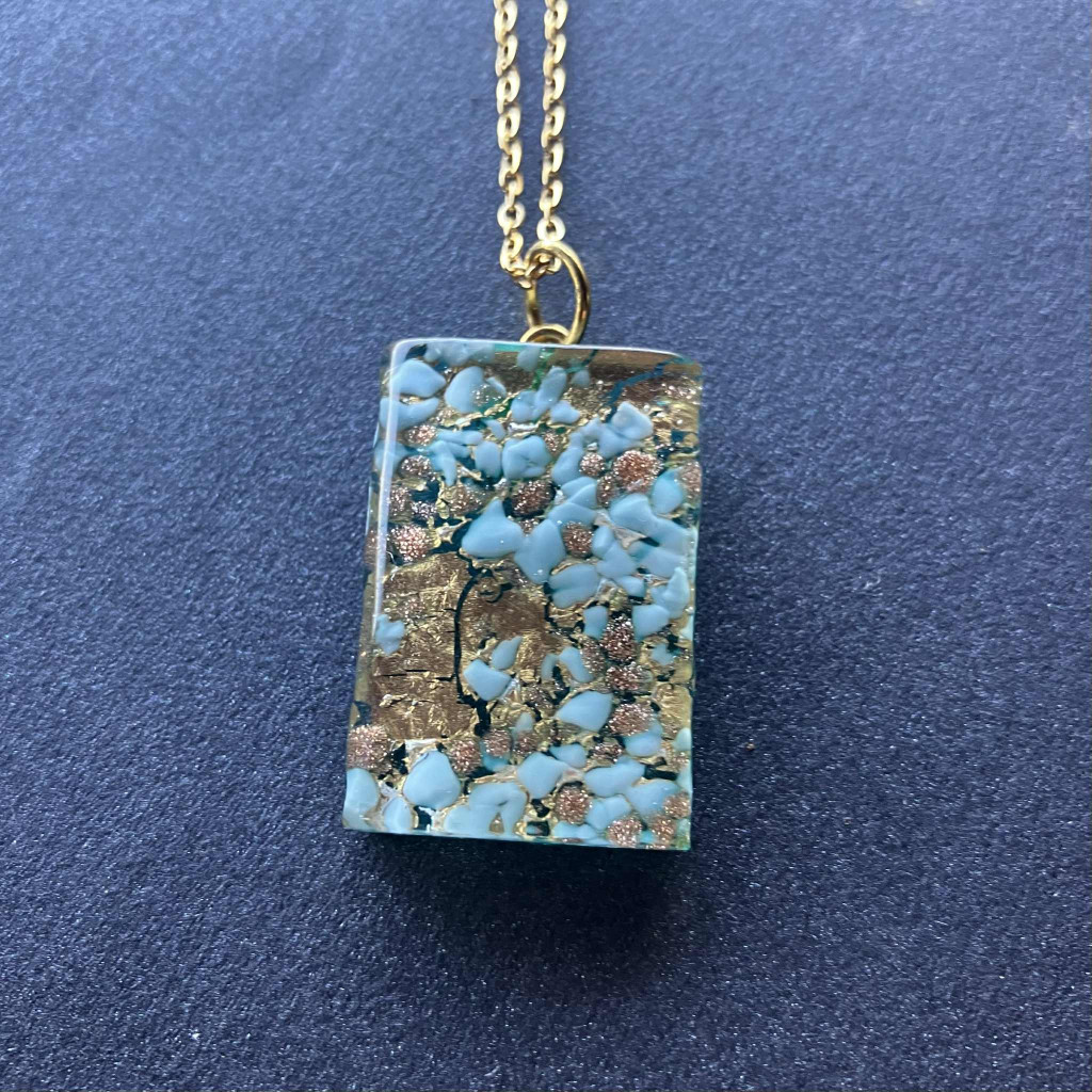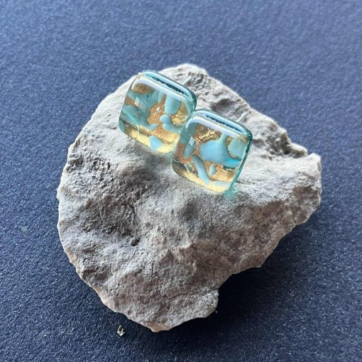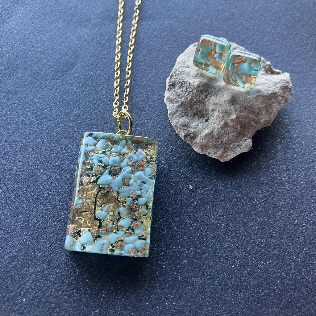 Eredeti, kézzel készített, egyedi muranoi üveg szett. A szett tartalma egy egyedi, bedugós muranoi üveg fülbevaló és egy egyedi, kézműves medál, hozzá illő lánccal, díszdobozzal.
