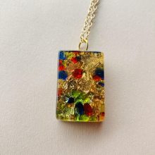 Eredeti, kézzel készített, egyedi muranoi üveg szett. A szett tartalma egy egyedi, bedugós muranoi üveg fülbevaló és egy egyedi, kézműves medál, hozzá illő lánccal, díszdobozzal.