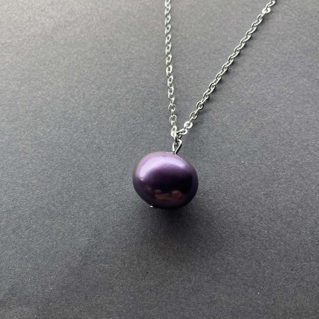 Fantasztikus fényű, lila kagylógyöngy medál, ezüst színű nemesacál nyaklánccal. Igazi ritkaságnak számít: a shell pearl valódi alapanyagok felhasználásával, mesterséges technológia segítségével keletkező csoda, amely méltán hívja fel magára a figyelmet.