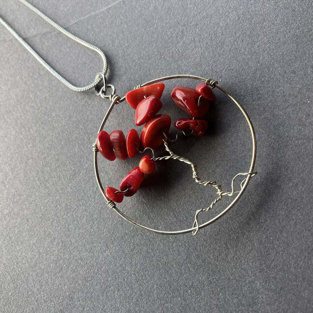 Piros Korall életfa medál és nyaklánc. A lánc hossza 45 cm, a medál átmérője 3 cm.