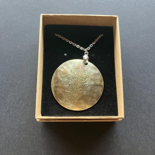 A medál éteri színeit a hőkezelés adja, mintázata karcolással erezett. Antik bronz árnyalatú lánccal, díszdobozzal.