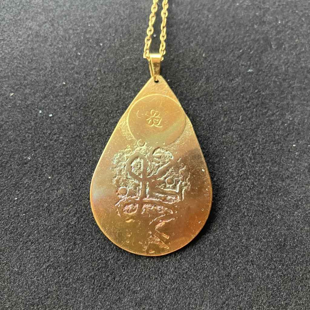 Gyönyörűen fénylő, csepp alakú réz medál a letisztult formák kedvelőinek.