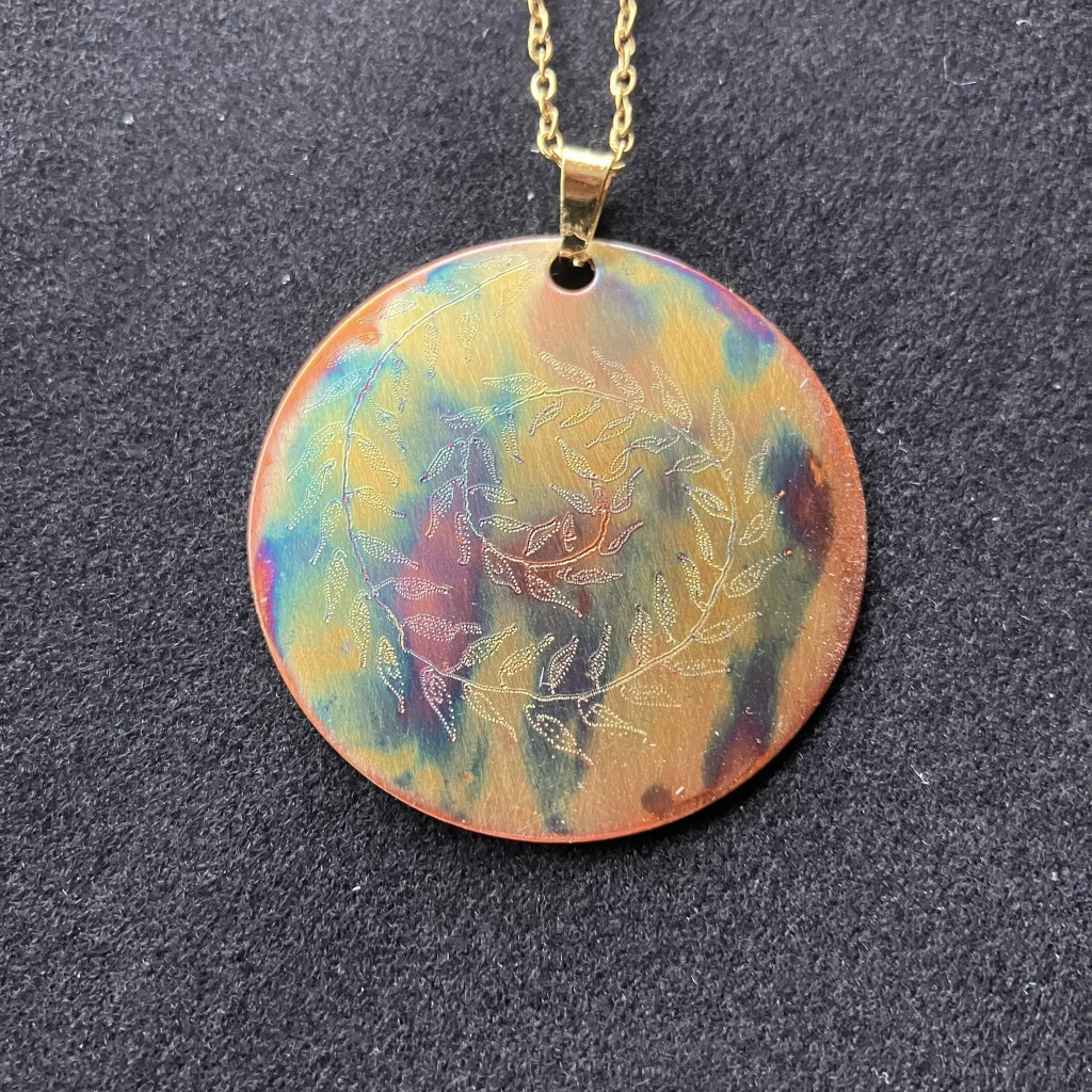A medál éteri színeit a hőkezelés és felületkezelés adja, mintázata karcolással erezett. Arany árnyalatú lánccal, díszdobozzal.
