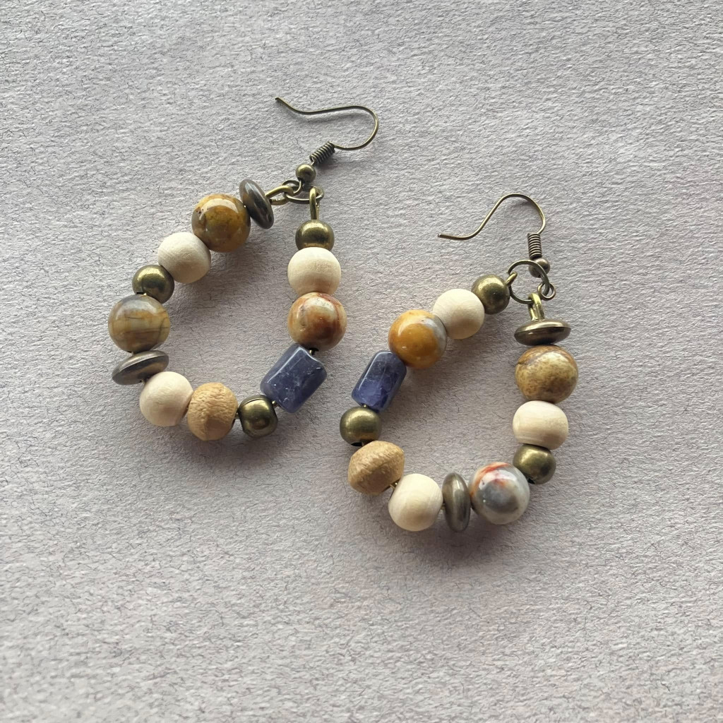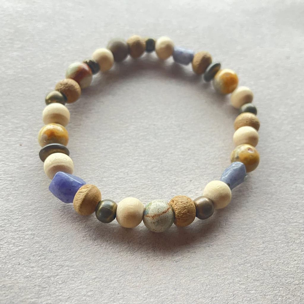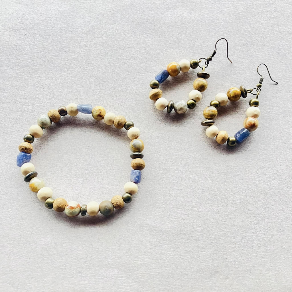 A szett tartalma még egy fülbevaló (3 cm hosszú) nyers kék kalcit, térkép jáspis és szantálfa gyöngyökből.