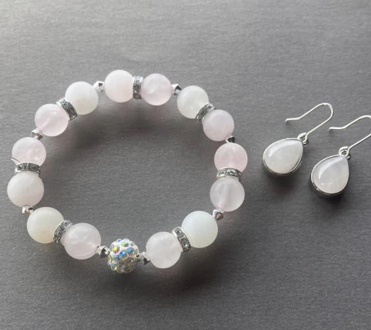 A karkötő 10 mm-es Rózsakvarc szemekből áll, középen egy strasszos gyönggyel. A fülbevaló csiszolt rózsakvarc ezüst színű foglalatban.