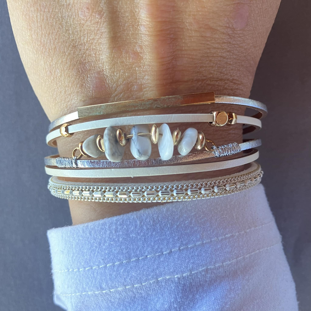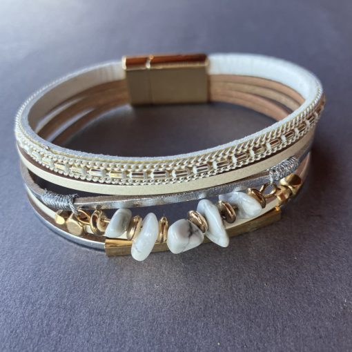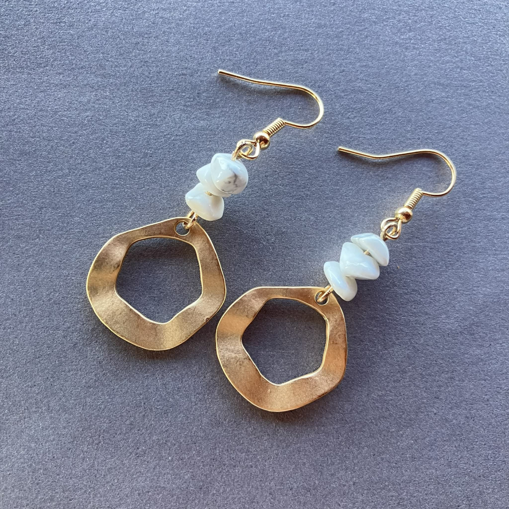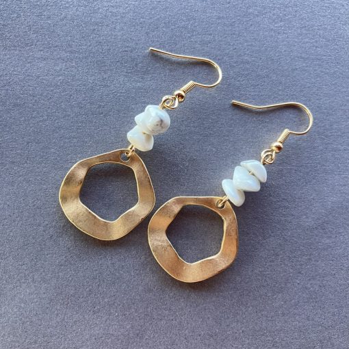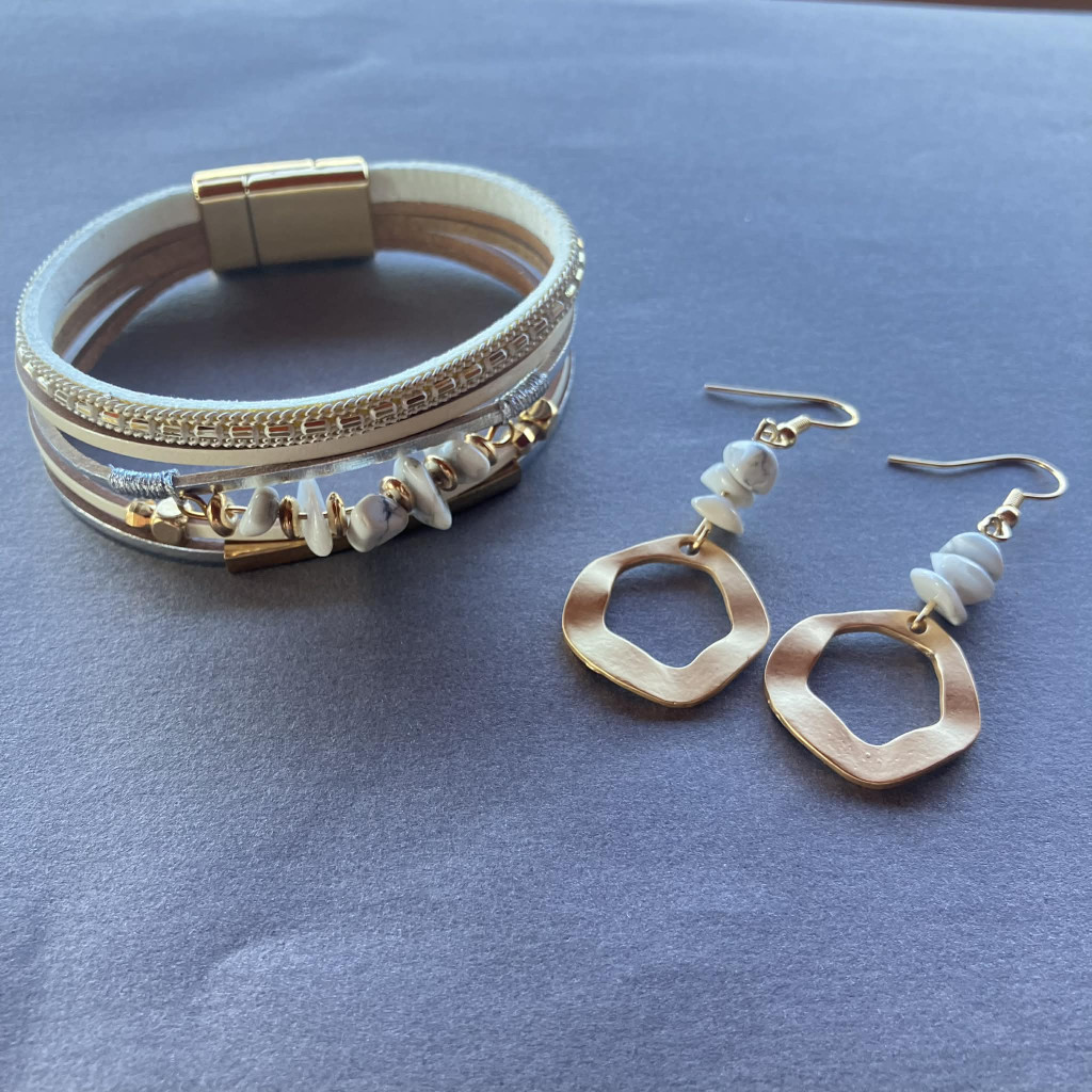 A szett tartalma egy howlit ásvány és sárgaréz kézműves fülbevaló, valamint egy ásványokkal díszített műbőr karkötő.