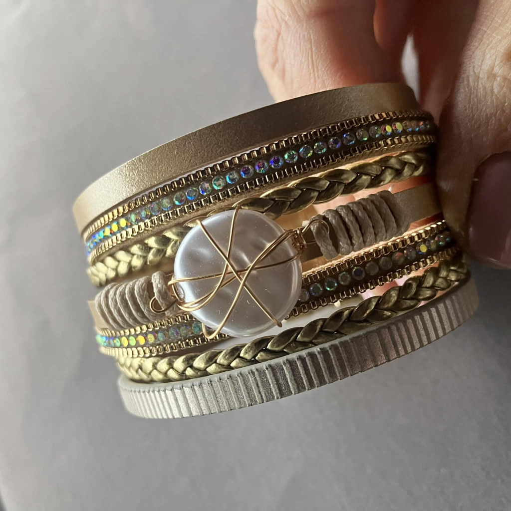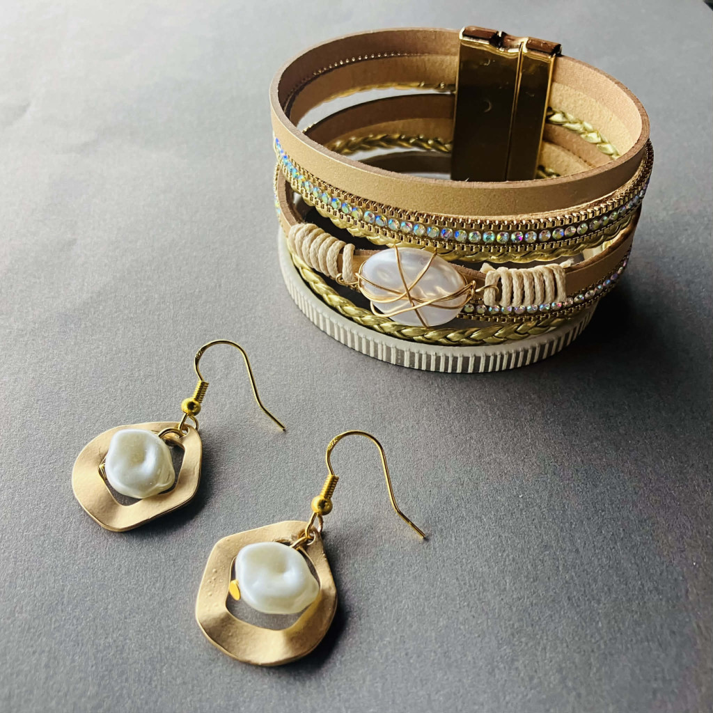 A szett tartalma: Mágnes kapcsos több szálas design műbőr karkötő, tekla gyönggyel és egy egyedi tekla, sárgaréz kör fülbevaló.