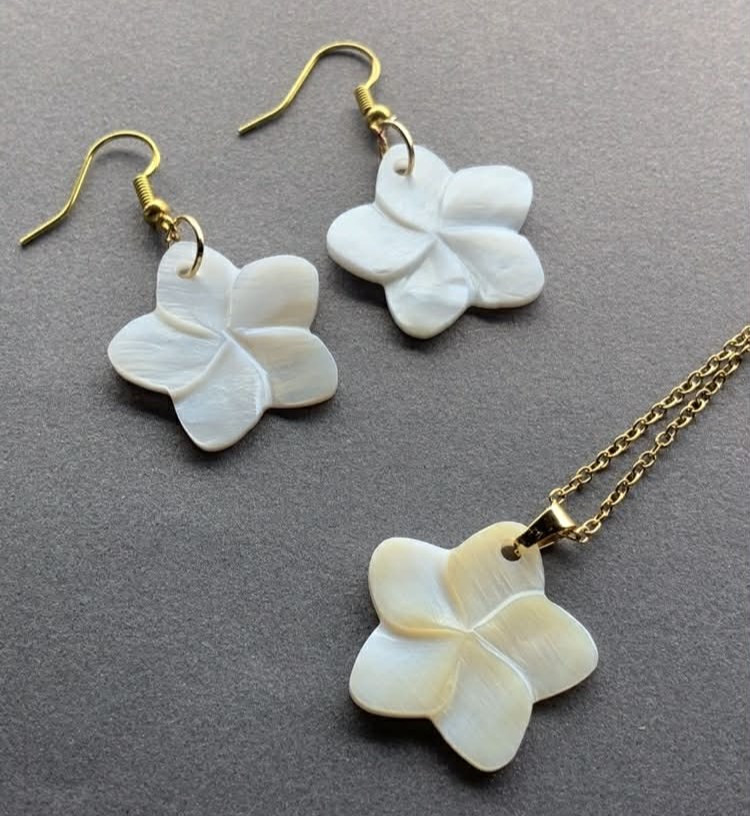 Ez a természetes kagylóból faragott virág ékszerszett finom, letisztult megjelenést képvisel. A tört fehér, csiszolt kagyló lágy fénye természetes eleganciát ad, miközben a virág forma a könnyedséget és a nőies harmóniát idézi.