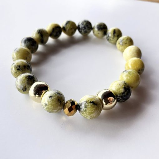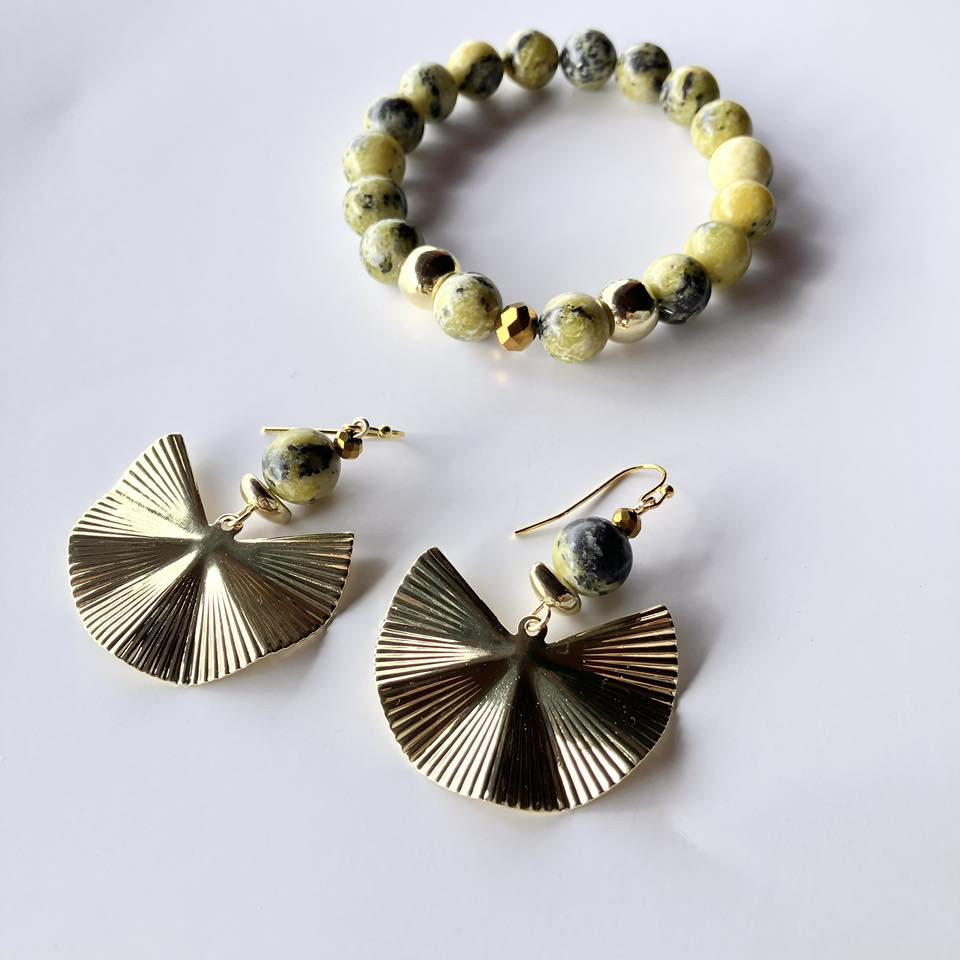 A karkötő 10 mm-es kövekből áll, a fülbevaló halvány arany színű galvanizált fémötvözet epidot szemmel.