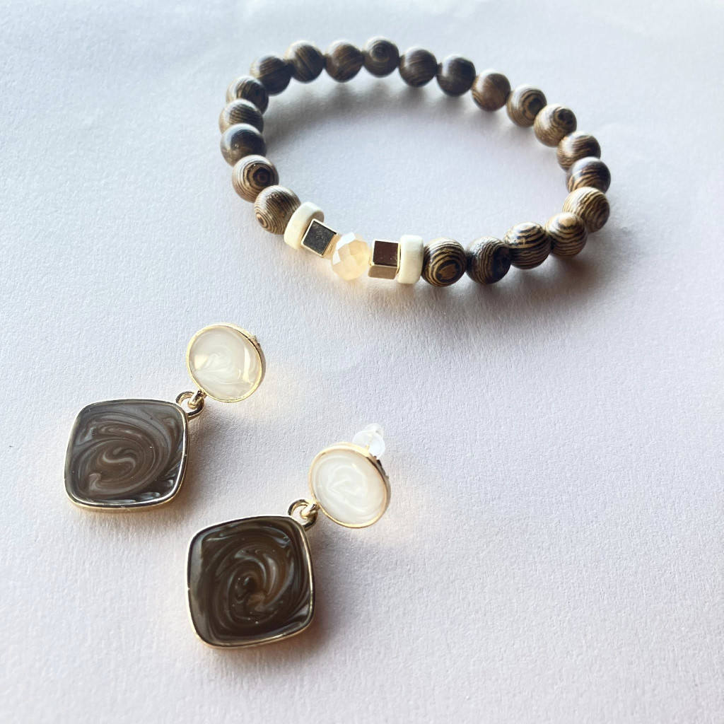 A fülbevaló fémötvözet alapon gyanta, a karkötő 8 mm- es fagyöngy.